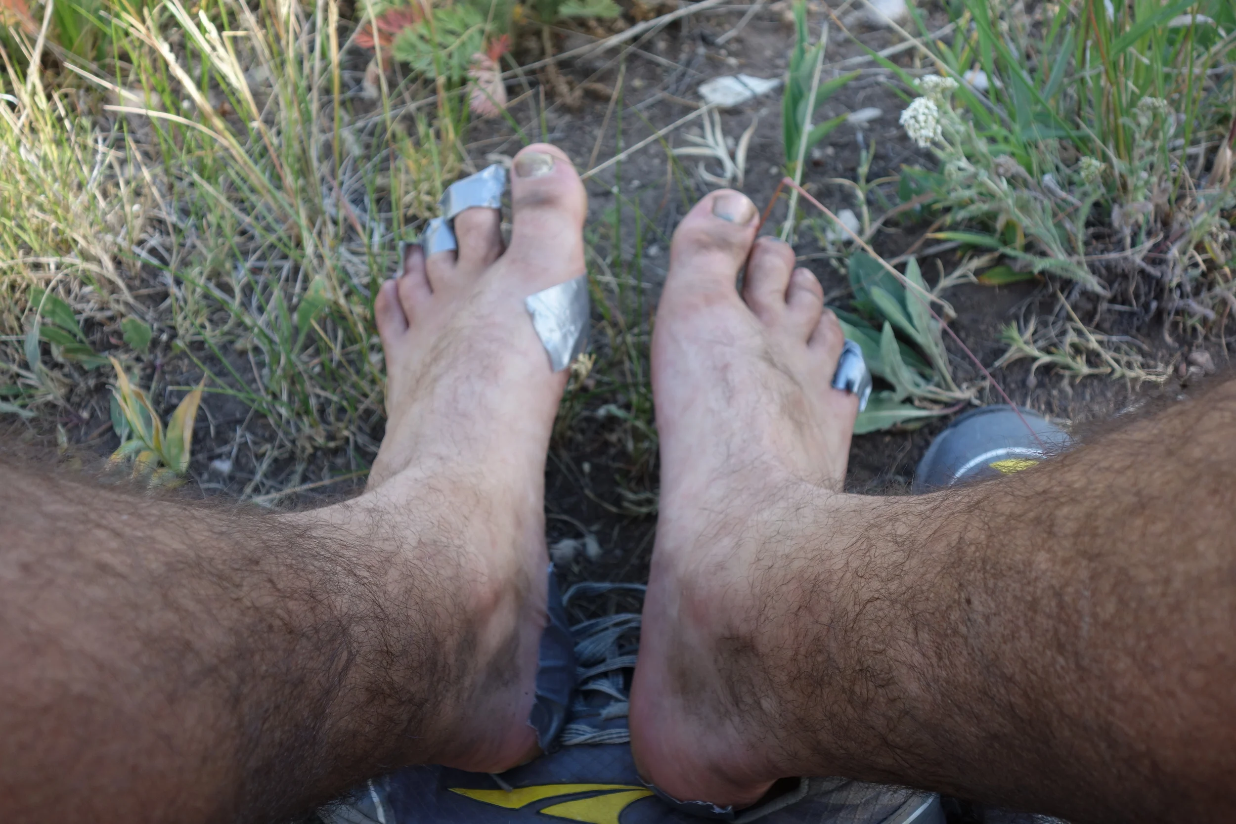 While the camera rolled, I put duct tape over probably 60% of my feet. Seven of my toes had hot spots, as did the sides of my heels, the balls of my feet… My shoes are starting to wear down quickly, the insoles I’ve been using have over 700 miles of hiking and trail running on them, and my feet have been wet since Glacier. My feet were basically two giant blisters in the making. Embrace the Bru-toe-lity.